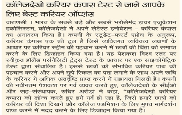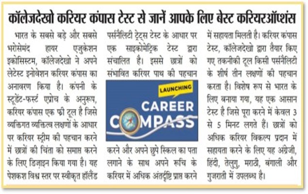 Through the dissemination of a national press release to regional and mainline media, the audience was acquainted with the CollegeDekho Free Career Compass Test which helps students identify career paths.